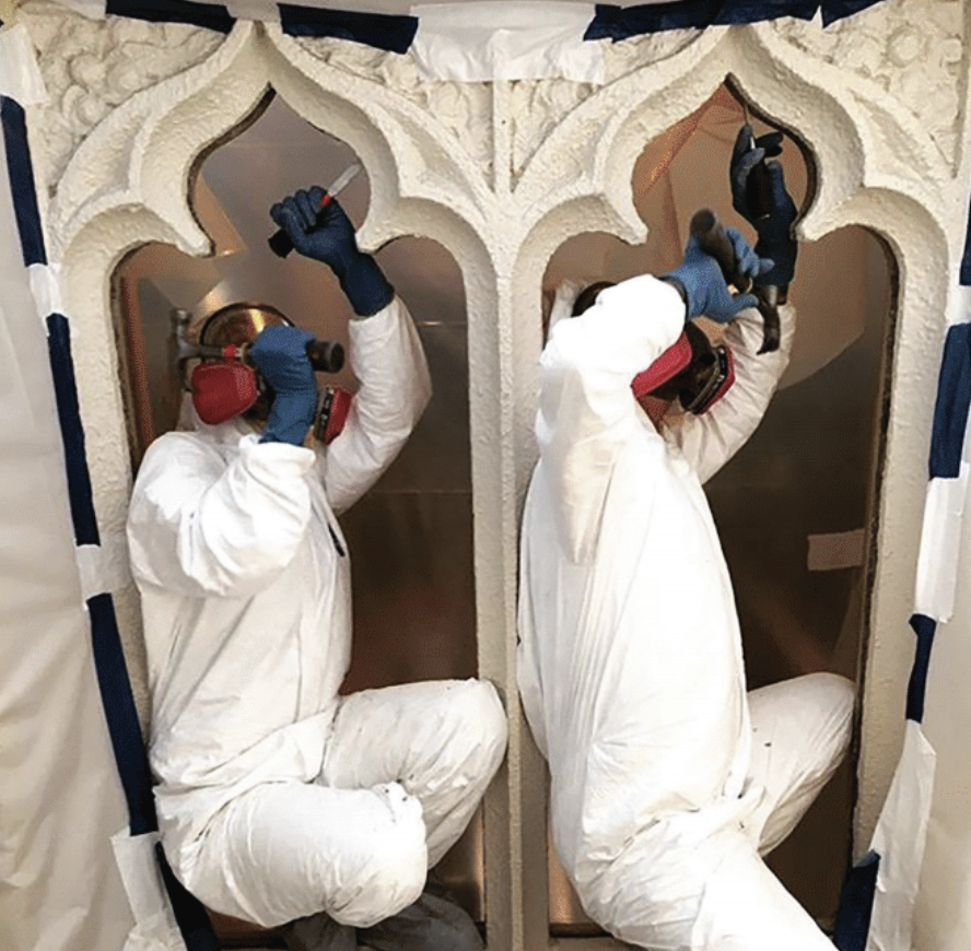 In addition to lead dust, the team encounters other particulates during the treatment of panels. During the puttying phase, both sawdust and calcium carbonate (whiting) are used. Puttying is restricted to a small room with a dedicated air scrubber. The small cubic square footage ensures the air is scrubbed at a fast rate, and during high volume work, the filters are checked once every two weeks. P100 filters for respirators also effectively protect against sawdust and whiting.