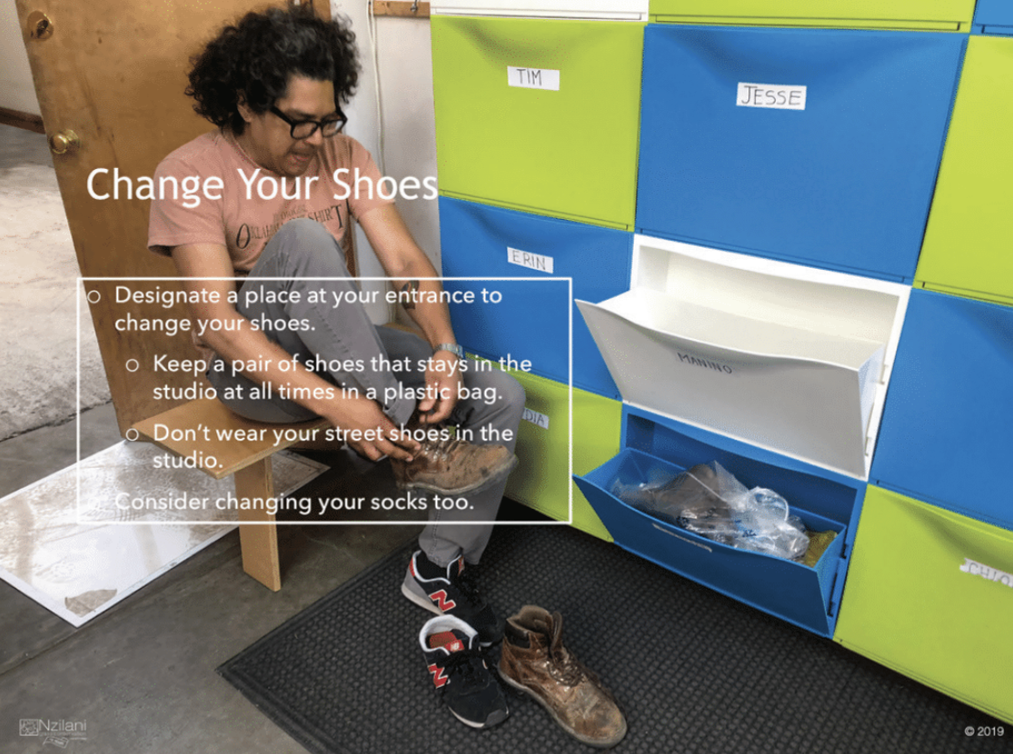 Air quality and surface testing for lead has given us quantifiable data for changing such long established studio practices such as glazing (building) windows with bare hands; using drinking cups in the work area; and wearing the same clothes at work and at home, elevating exposure risks to self and others. Testing has resulted in implementation of recommendations such as wearing disposable gloves, separating work and eating areas, changing clothes and footwear, and washing hands often.